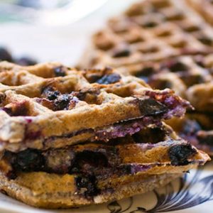 For a long time, I had a fear of putting blueberry batter into my waffle iron. I mean, maybe it was a valid concern. The blueberries do sorta’ explode, and that could lead to burning. But I guess you can add “burnt blueberries” to the list of things I no longer fear. The thing is, they taste good. Call them “caramelized,” if you must. The trick is to spread the batter a bit, and close the lid slowly but firmly. You will get beautiful, evenly cooked waffles that are literally bursting with berries!