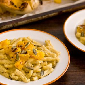 - Set aside some of the sauce (you can reserve a cup or so for veggies if you’d like to throw some on top.) Add the pasta, and toss to coat. Serve topped with additional roasted squash and a sprinkle of nuts.