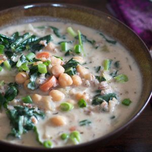 Invite a friend over, break some bread (olive sourdough spoken here), and inhale big bowlfuls of comfort like this one. Chewy rice and succulent chickpeas, fragranced with rosemary, thyme and celery, pulled together by luscious cashew cream. And of course I throw in a little kale at the end for good measure. I chose lacinato because it holds its bite, but you, of course, can use whatever you like! Some green onions on top add another whiff of of flavor and even a hint at Springtime, which — hard to believe — is just around the corner. I promise.