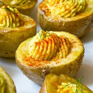 A tender roasted potato with a creamy, eggy filling. Sprinkled with a little paprika and a sprig of dill, they taste as irresistible as they look.