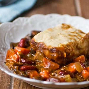 Made this today–it was delicious! It took me about 45 minutes of prep time. I rolled the potato biscuit dough out and used a biscuit cutter to make biscuits, which I then placed across the top of the stew before baking. The only issue we had with it is that it came out very soupy! I even added some cornstarch to thicken it, but it didn’t do the trick. I think next time I will use 2 cups of broth, rather than 3. Still, even with the soupiness, it was truly delicious!