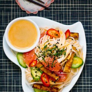 This is a really pleasing spin on a Vietnamese noodle salad. It’s bright, fresh, zesty and studded with savory smoky flavors, too. What I love about cold noodle salads like this, is how the contrasting flavors create something otherworldly. And it’s easy on the eyes, as well. Pretty jewels of ruby red grapefruit, set off with the black sesame seeds. Wasn’t pink and black your favorite color combo in the 80s? Yes, mine, too!