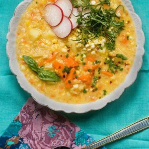 - Taste for salt and seasoning. Serve garnished with fresh corn kernels, fresh herbs and radishes.