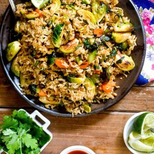 • Add the Brussels mixture back to the pan, and drizzle in the soy sauce, lime juice and agave. Cook for 3 more minutes or so, until rice is lightly browned. Taste for salt. Serve with plenty of Sriracha!
