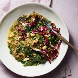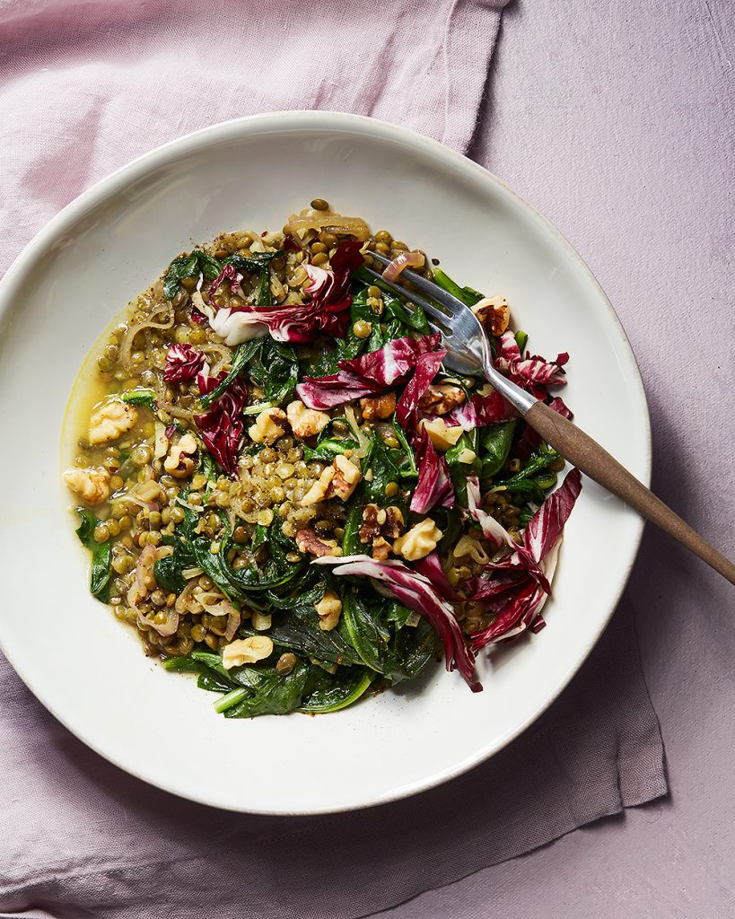 - Add vegetable broth and bring to a boil. Add the greens and cook down for about 5 minutes. Add the lentils and toss to heat through. Serve topped with walnuts!