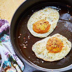 - Preheat a well seasoned cast iron over medium heat. Spray with a little cooking spray (I like coconut). Do a tablespoon test of the egg white. It should cook in about 2 minutes and be matte on top, golden underneath. If it burns, lower the heat, if it takes too long, raise it a little.
