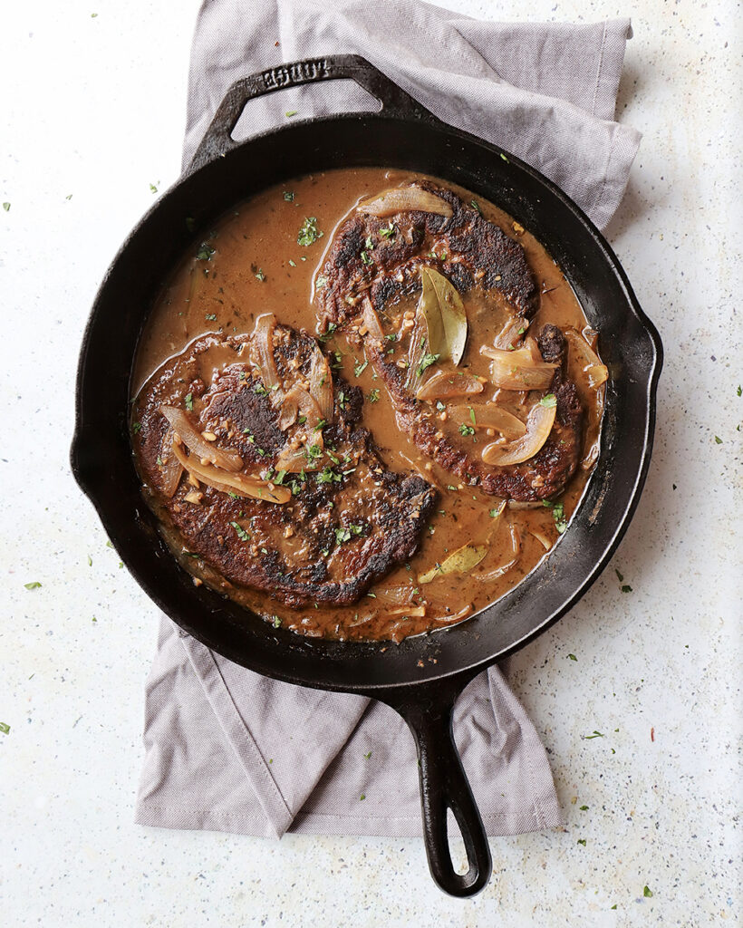 - Once warm, return the steaks to the brothy pan and submerge, spooning broth and onions over. Cover the pan and let cook for about 30 minutes. The broth should be simmering this whole time, but not boiling too rapidly.