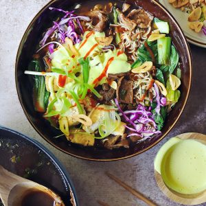 • Measure broth and make sure it comes to 8 cups. Add to the wok and heat through. If you need to add a little water that’s fine. Bring to a boil. Add the green part of the bok choy to wilt. Add 2 to 3 tablespoons of tamari and taste for salt.