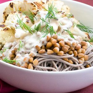 - Divide soba noodles into big bowls. Top with lentils, cauliflower and plenty of sauce. Garnish with herbs and serve!