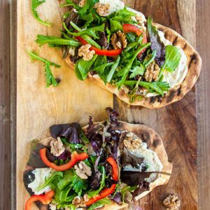 Place the dough on the grill. It should take about 3 to 4 minutes for the bottoms to get grill marks and become firm. If it takes a little longer that’s cool, but definitely check one after 3 minutes. Use tongs to flip the bread over and cook for another 2 minutes or so, until grill marks appear.